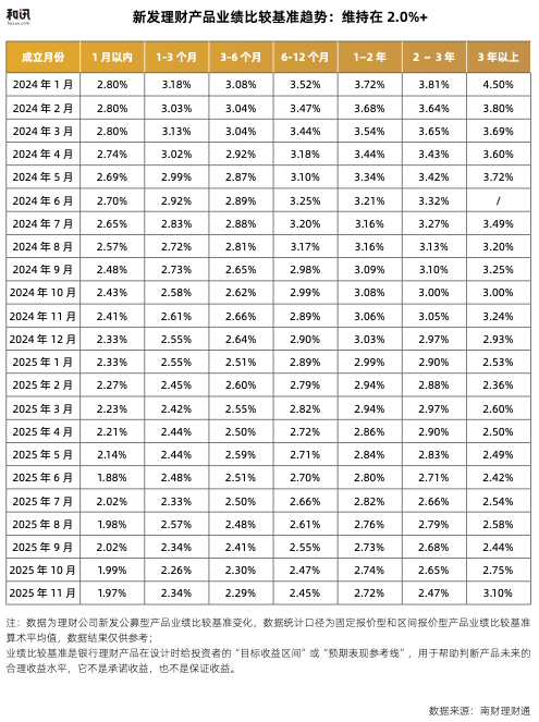 2025年以来,新发理财产品业绩比较基准多集中在2.0%—3.0%区间,其中短期限产品普遍在2%左右,中长期产品略高,但整体呈现下行态势。过去投资者熟悉的“3%+稳健收益”正在逐步退出主流视野。
